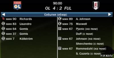 | Лион---------------------Фулхем ---0---------------------------2--- ---------------------------Джонсон --------------------------Шевченко