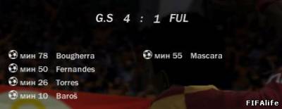 | Милан----------------Фулхем ----3-----------------------3--- Голы: Д.Бент(2), Хигуан ---------Шевченко, А.Джонсон,Э.Джонсон Рома----------------Фулхем -----0----------------------3----- -----------------------Шевченко -----------------------Джонсон -----------------------Дафф Фулхем ------------------Рома ----3------------------------2--- Джонсон----------------Баптиста Ромедахл---------------Пизарро Казорло